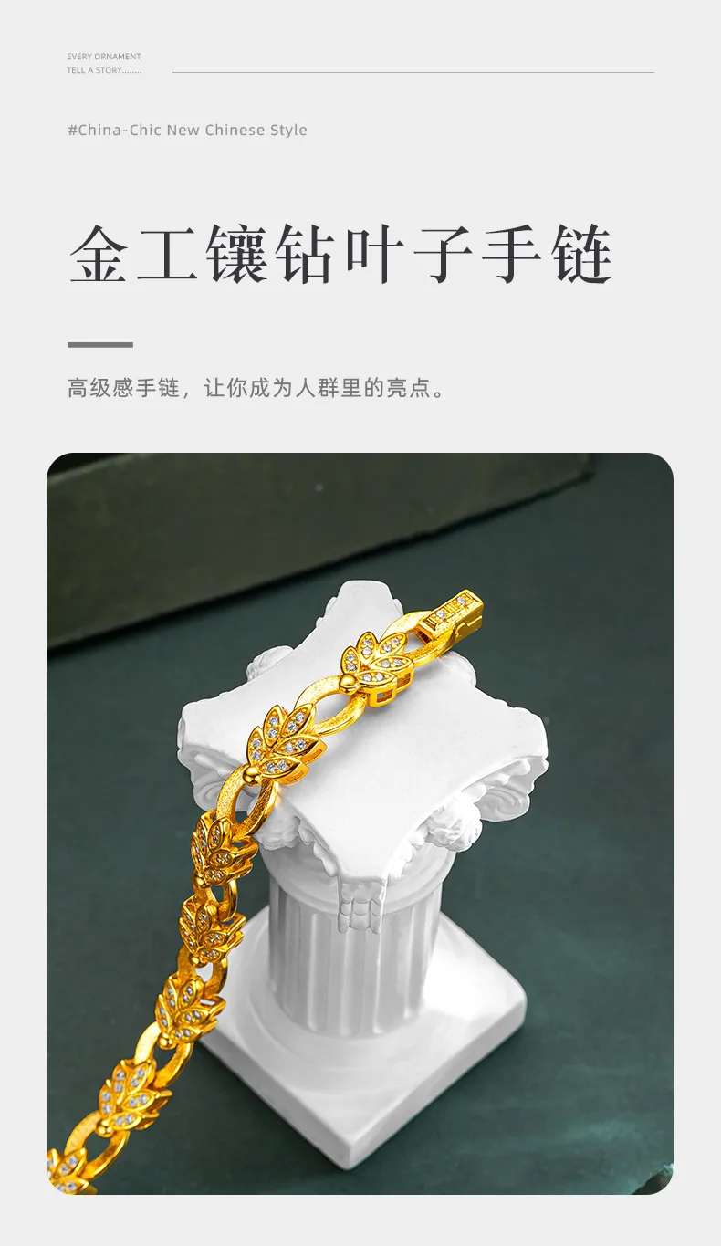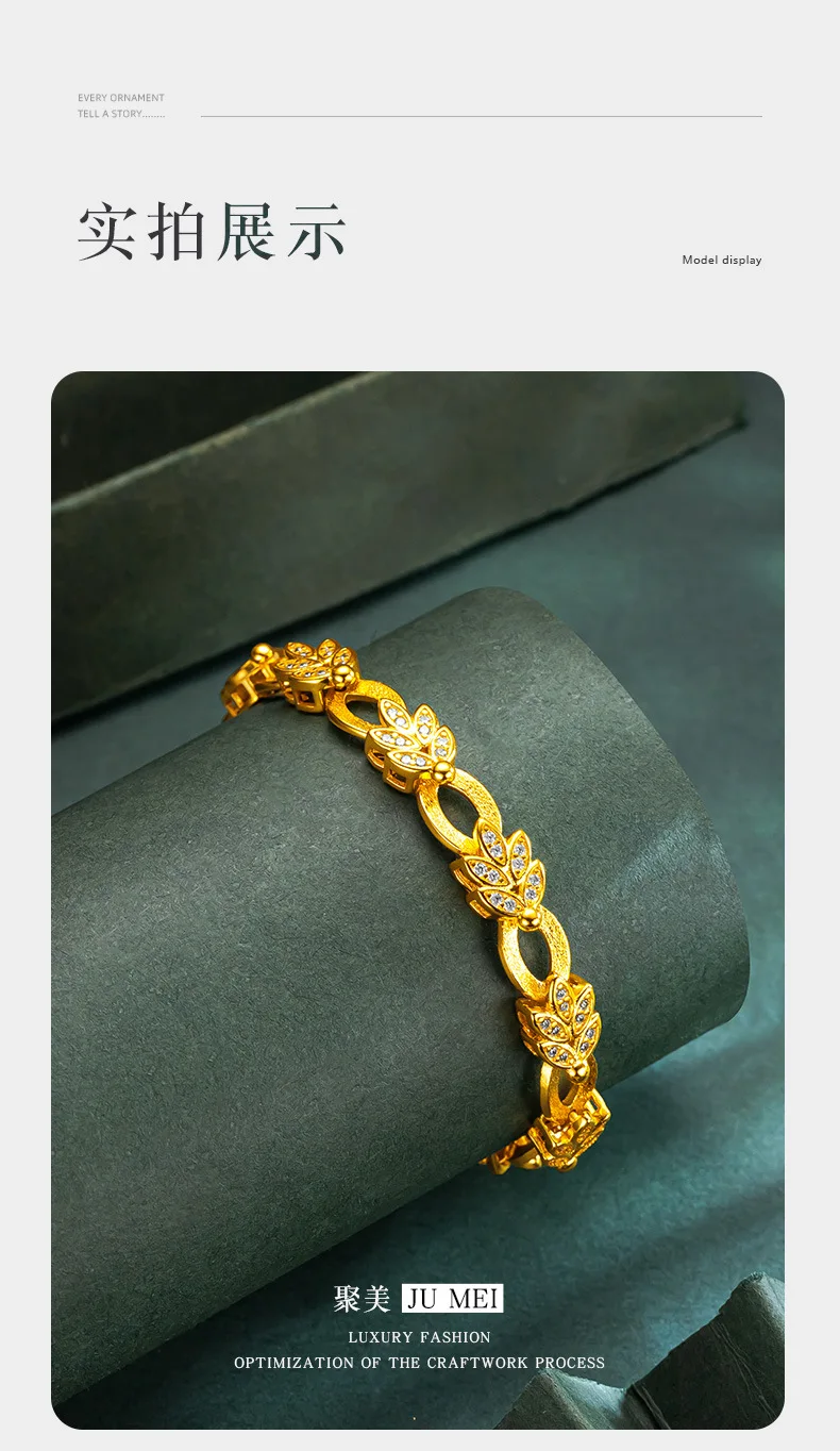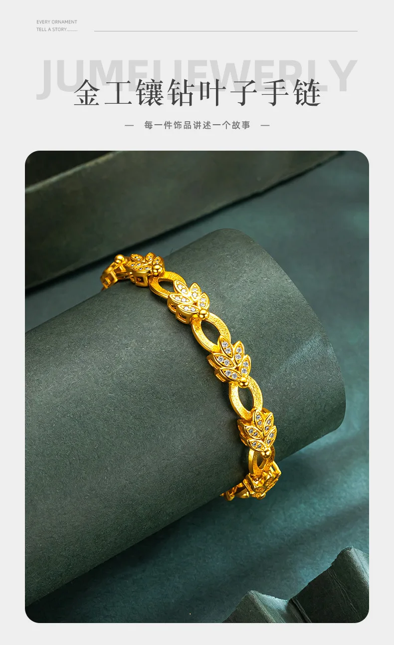 9999 24K real gold diamond leaf bracelet with gold color clip buckle design as a birthday gift for your girlfriend